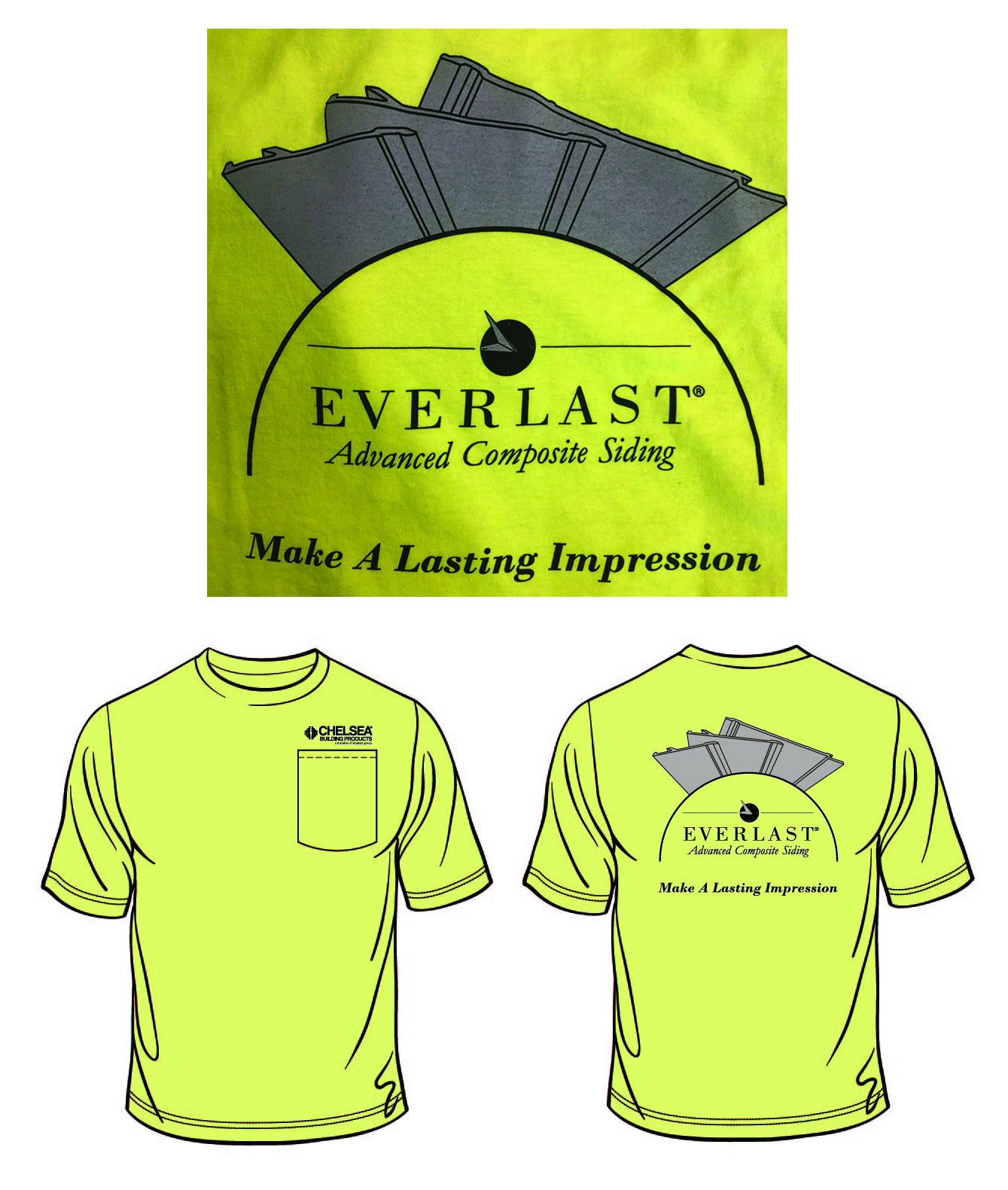 Everlast pocketed T-Shirt. Gildan brand Cotton/Poly blend with DryBlend moisture wicking fabric. Individually bagged. Back of shirt features all three Everlast siding products – 4.5″ lap, 7″ lap, and Board & Batten. Front has the Chelsea Building Products logo. LIMITED TIME ONLY!